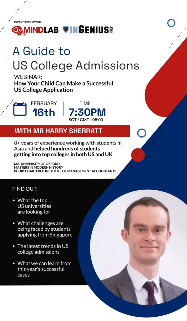 Mindlab, in partnership with InGenius Prep, invites you all to an** exclusive webinar **with experienced US College Admissions Consultant, Harry Sherratt, to provide relevant and helpful insights on how to make a successful US College Application for your child.